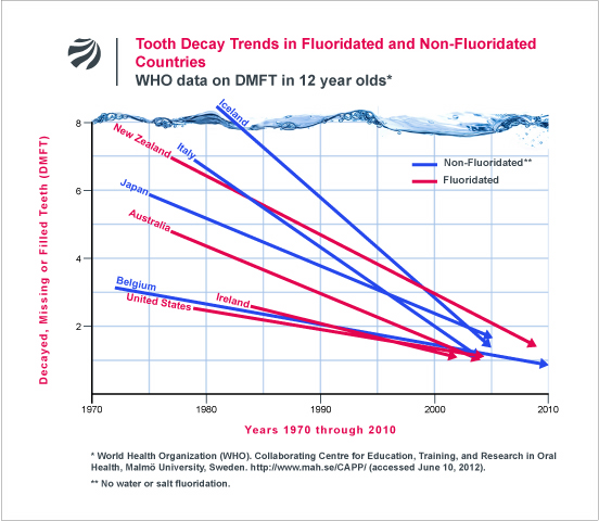 World Health Organization Oral Health Database (2012) – “Tooth decay trends in fluoridated and non-fluoridated countries ” – Caries are declining regardless of fluoridation status – reference Fluoride Action Network .